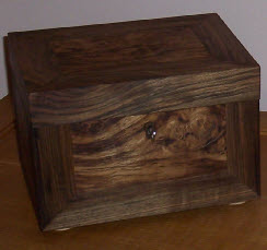 A jewellery box made entirely from Burr Oak, Walnut and Chestnut. No veneers or man made materials have been used in its construction. The box has four layers each of which consisting of different size compartments to facilitate different size jewellery from large earrings to watches and necklaces. The three removable trays are lined with black wool felt and incorporate a handle on each side to aid their removal. Solid brass ‘Stop Hinges’ have been used which enable the lid to stay open in an upright position and a brass lock has been fitted to keep jewellery secure. The box sits on four turned discus shaped feet.. Price £350 Box now sold