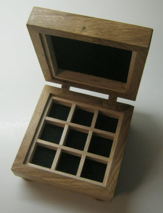 Made entirely from Oak and Ash. The box sits on four circular feet and has hinges made from Ash. It is lined in a soft and rich black wool and will accommodate nine pairs of cufflinks. The centre panel shows off the exciting grain of burr Oak. No veneers have been used in the production of this box.